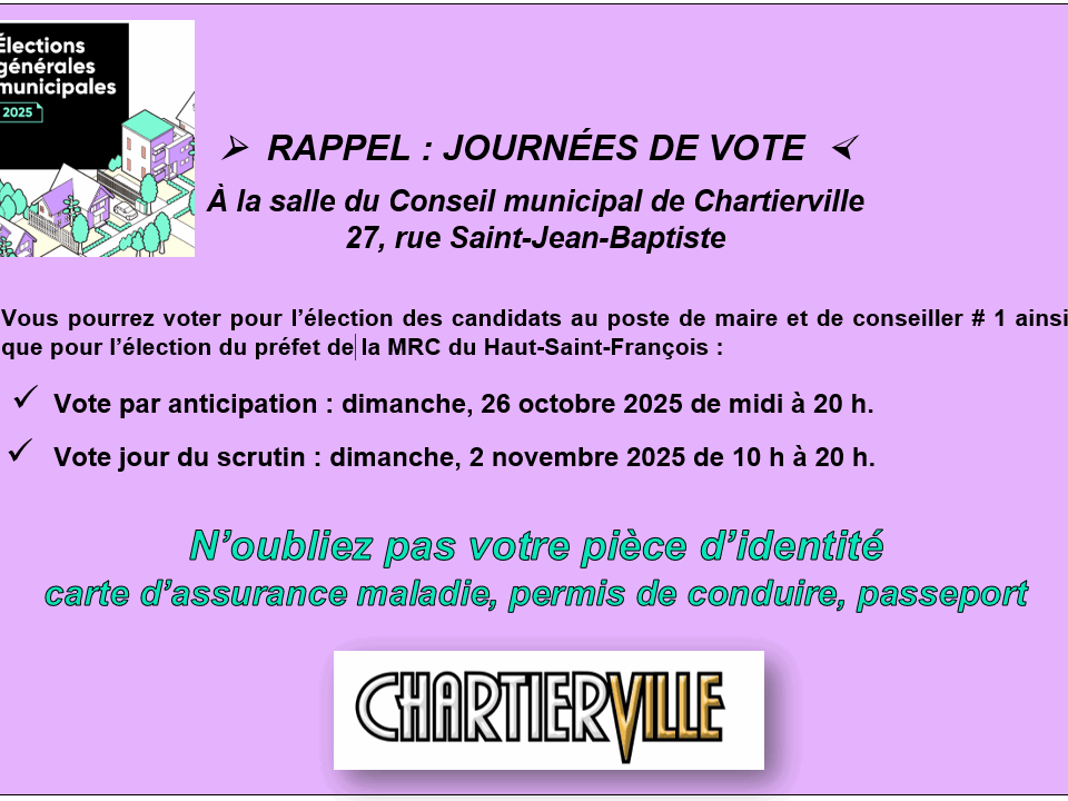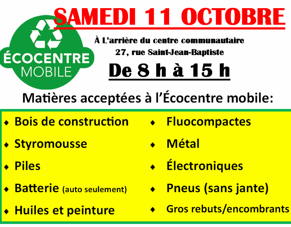 !! Nouveauté pour 2025 !! La municipalité de Chartierville offrira deux «Écocentre mobile» durant l’année 2025. Ceux-ci se tiendront au centre communautaire de Chartierville en remplacement […]