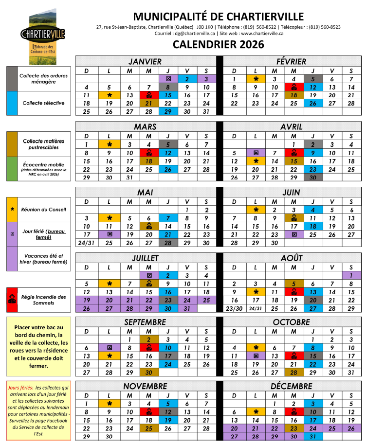 La collecte des ordures ménagères se fait les vendredis , aux deux semaines, en alternance avec les matières recyclables. Pour connaître ce que le prochain vendredi vous réserve, consultez la section Calendrier des collectes.